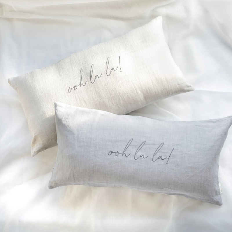 Linnen kussen met geborduurde tekst 'Ooh la la!'. Achterzijde effen, met geblindeerde ritssluiting.