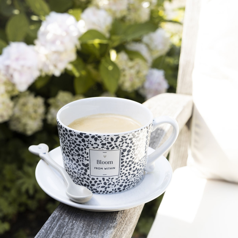 Off White mok Large met bloemprint en ingeslagen label met tekst 'Bloom from Within' en titane hartje. Leuk detail is het bloemetje op de bodem van de mok. Heerlijk voor koffie thee, chocolademelk, cappuccino, koffie verkeerd, kopje soep, bolletjes ijs .........