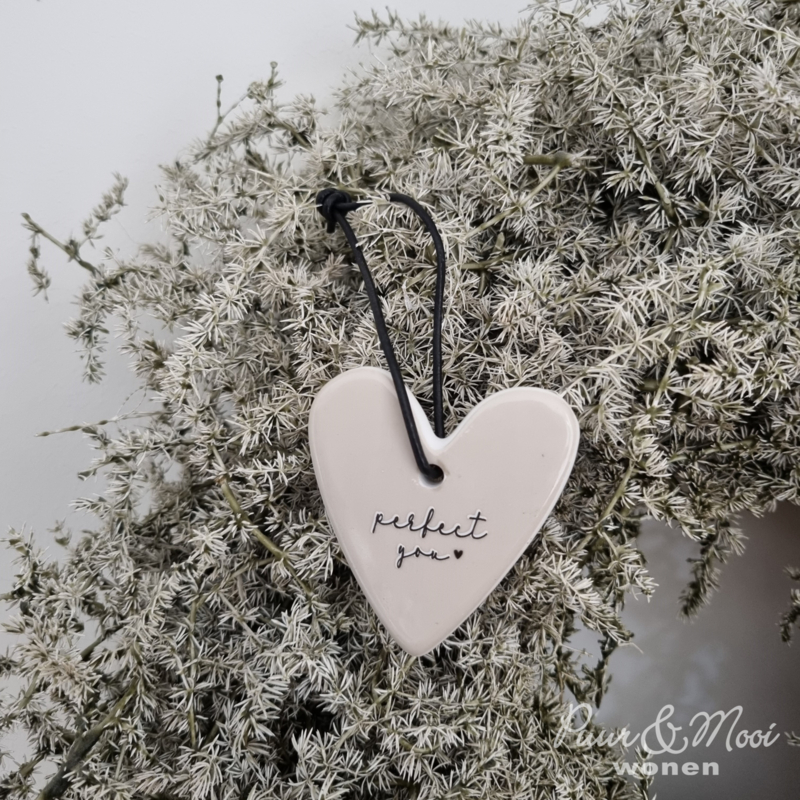 Keramiek hartje aan zwart leren ophangtouwtje, met tekst 'Perfect you ♥', voor decoratie aan een tak, in een kerstboom, aan een serveerplank, krans, en vooral leuk om cadeau te geven.