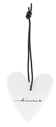 Keramiek hartje aan zwart leren ophangtouwtje, met tekst 'Kisses ♥', voor decoratie aan een tak, in een kerstboom, aan een serveerplank, krans, en vooral leuk om cadeau te geven.